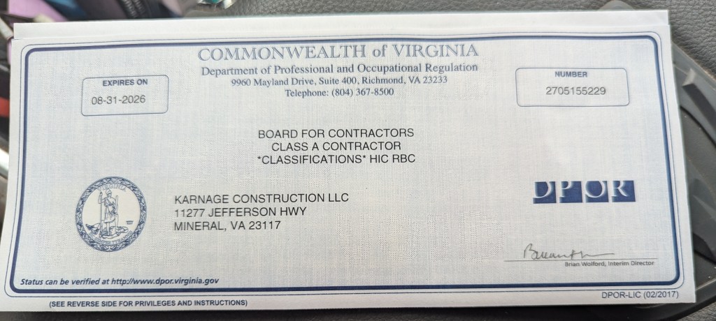 To check and see if a company is actually a contractor, you can go to the DPOR License Lookup Page. Search for the name of the company or the individual. If they don’t pop up, they might not be licensed at all!